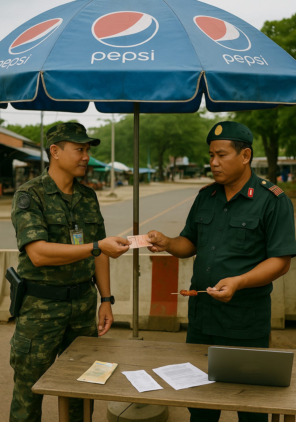 UBON RATCHATHANI, THAILAND — In a remarkable display of regional diplomacy—or possibly just a shared understanding of “mai pen rai”—escalating tensions along the Thai-Cambodian border reportedly dissipated Tuesday after a single 100 baht note changed hands between two uniformed men standing beneath a plastic Pepsi umbrella.