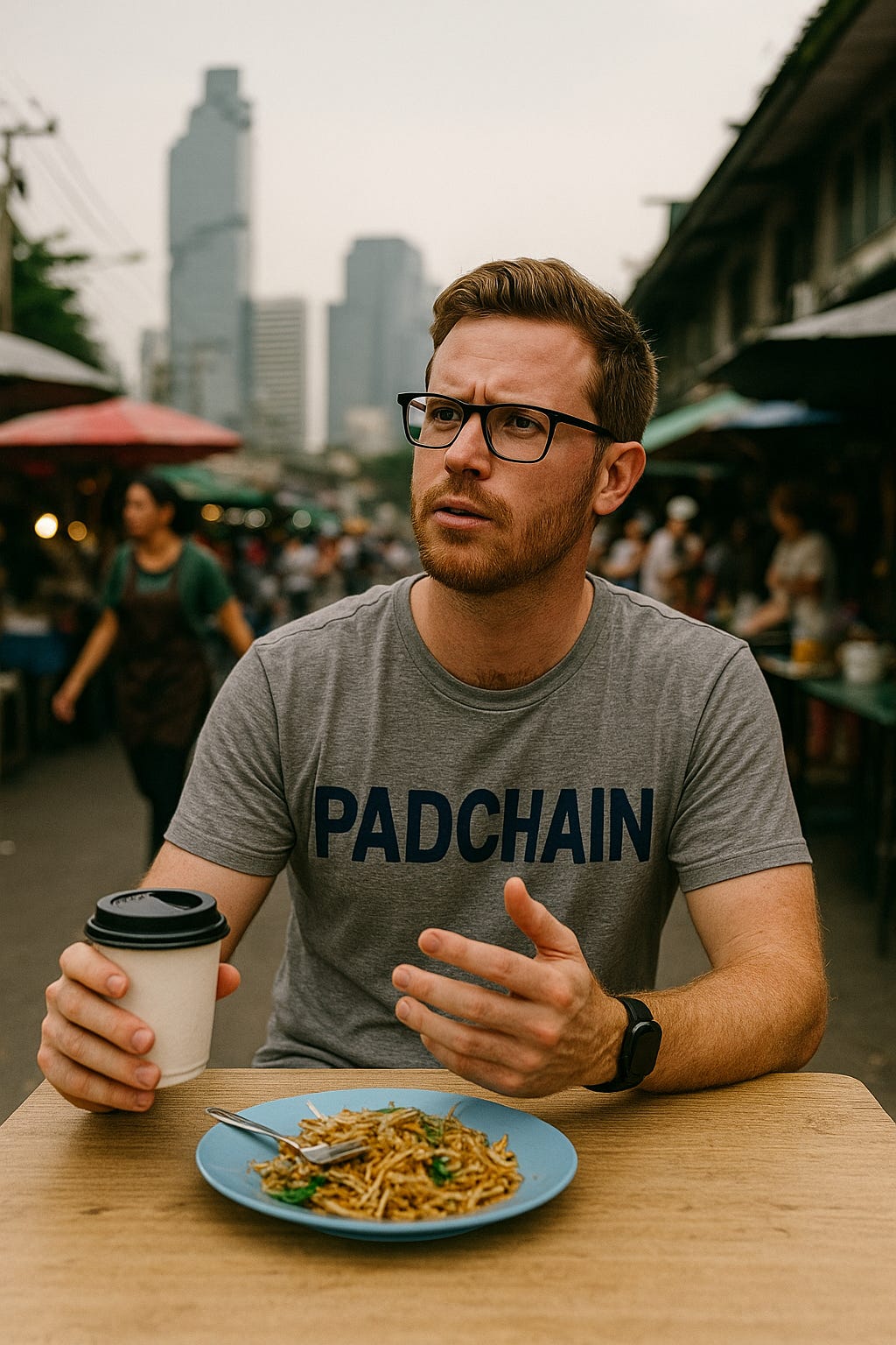BANGKOK, THAILAND — In news that surprised absolutely no one except himself, an American digital nomad has announced plans to “totally disrupt” Bangkok’s street food scene — by introducing blockchain payment systems, QR-code loyalty programs, and the kind of unchecked hubris usually reserved for failed TED Talks.