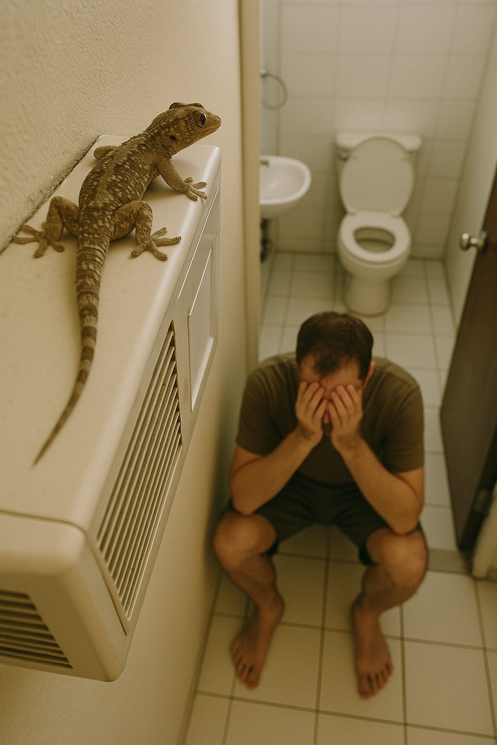 The gecko, unmoved, watched from the bathroom AC unit like a tiny god.