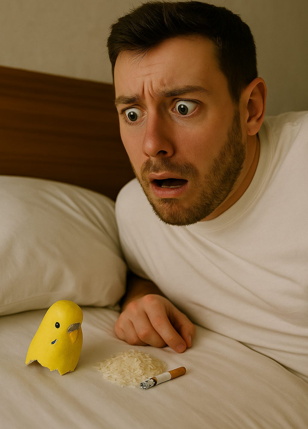 Hotel staff found the headless ceramic bird — a decorative souvenir from a beach gift shop — neatly placed on Ricky’s pillow the next morning, surrounded by grains of uncooked jasmine rice and one cigarette stub.