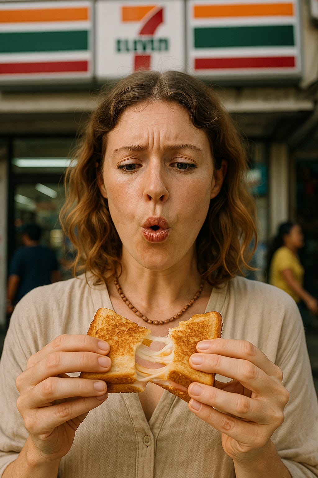 PHUKET, THAILAND — In what critics are calling “a staggering triumph of imagination over reality,” travel influencer Amélie S., 26, from Lyon, has been unofficially nominated for a “Best Actress in a Leading Delusion” award after describing her late-night ham and cheese toastie from 7-Eleven as “an authentic Thai gastronomic moment.”