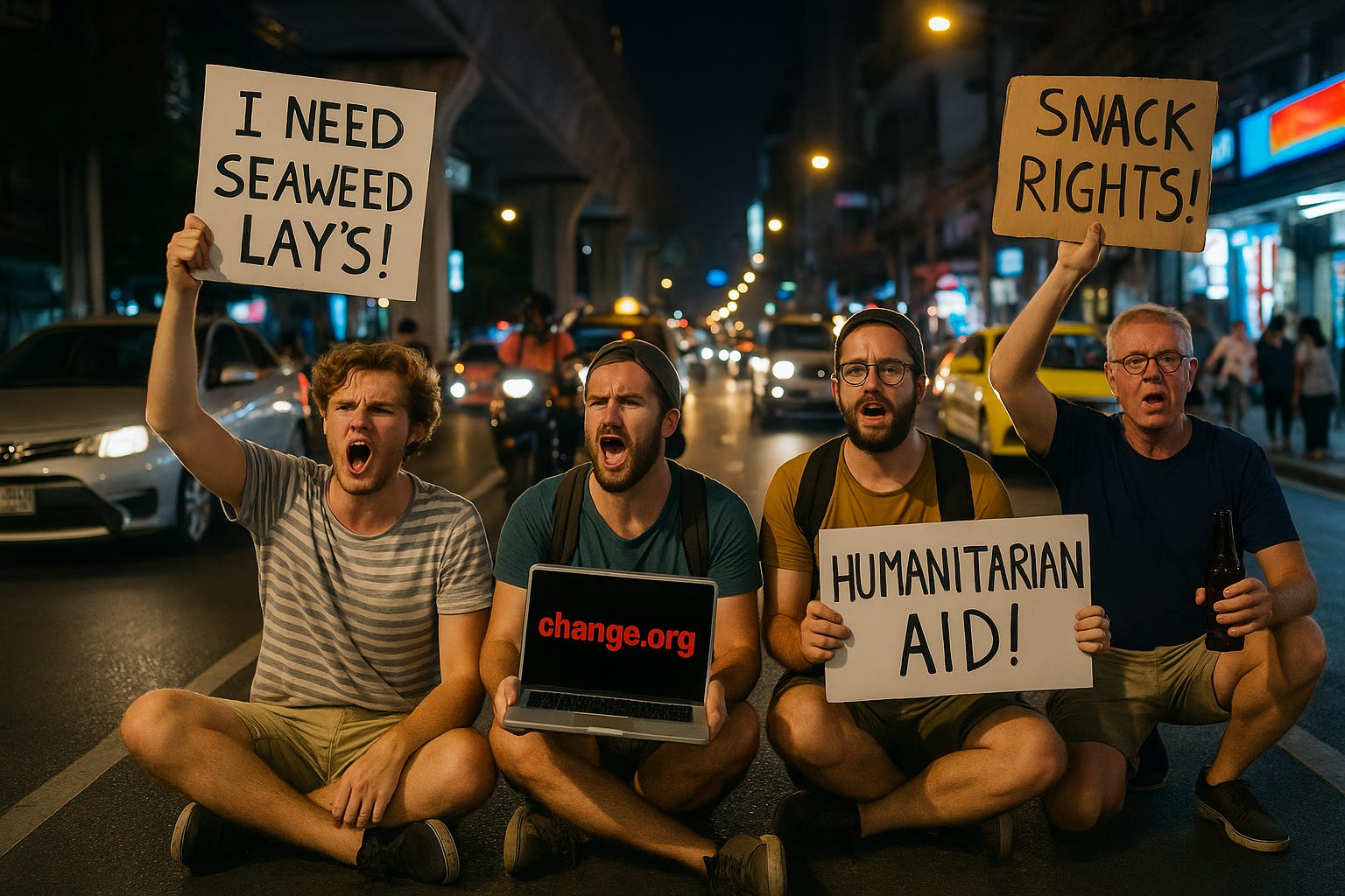 Within hours, confusion escalated into mild chaos. At least four American digital nomads reportedly blockaded traffic on Soi 11, demanding immediate snack restitution and “humanitarian aid.” Witnesses described them as “vocal but ineffective.”