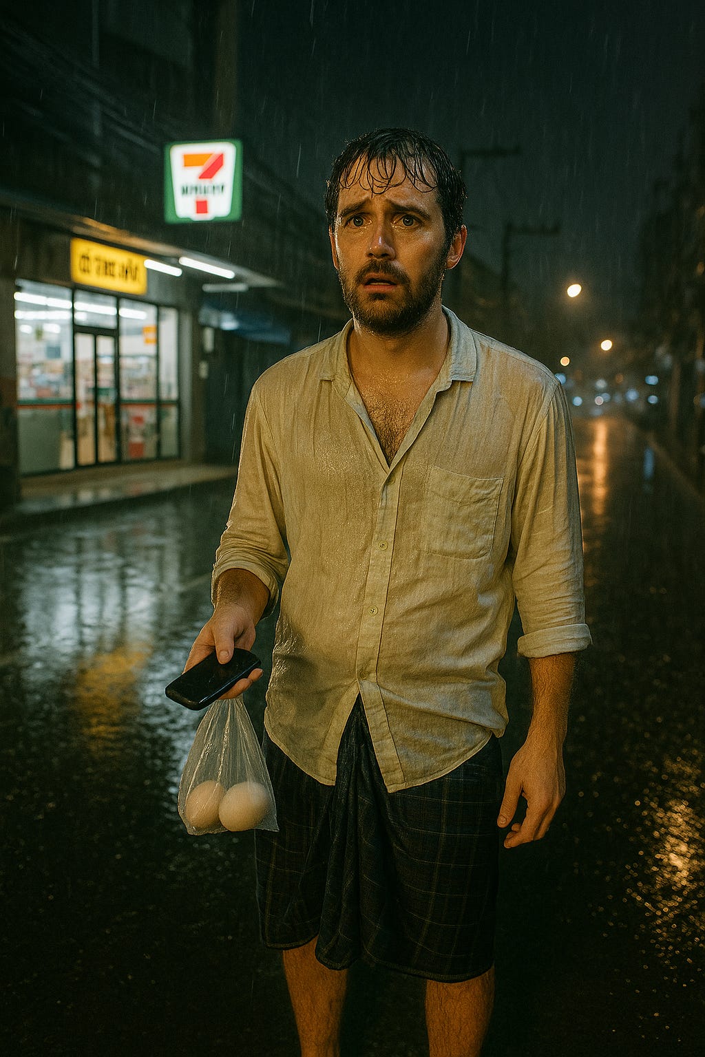 “He comes every night it rains,” said Aim, 22, a 7-Eleven cashier with the thousand-yard stare of one who has seen too much. “Always buys the same things. Lays seaweed. Two eggs. A single banana. Then he stands outside. Smoking. Watching the soi. Like a damp gargoyle.”